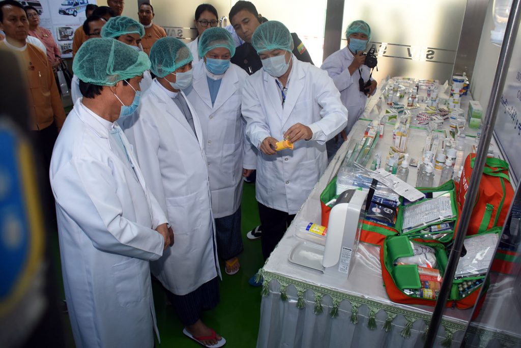 After touring the National Races Village, the President and party went to Ministry of Industry Pharmaceutical Factory (Insein) where Myanmar Pharmaceutical Factory (MPF) Managing Director U Ko Ko Lwin explained about production and distribution of pharmaceuticals from Pharmaceutical Factory (Insein) and other factories of MPF.