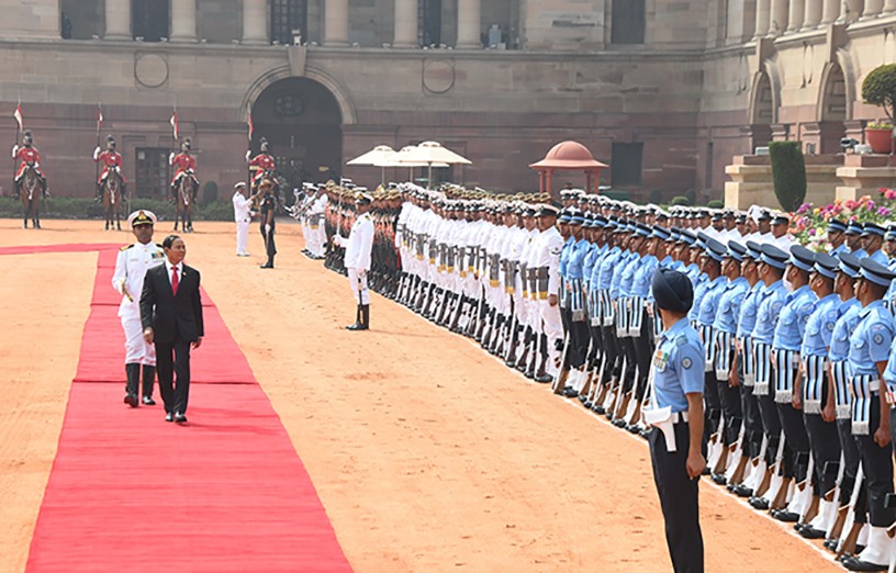 The President, the First Lady and Myanmar delegation attended the welcoming ceremony of his Indian counterpart at the latter’s residence Rashtrapati Bhavan.