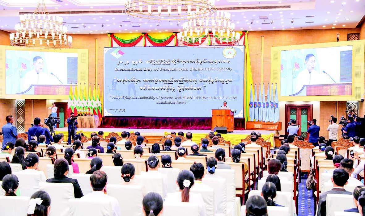 At the ceremony to mark the 2024 International Day of Persons with Disabilities held at the Myanmar International Convention Centre II in Nay Pyi Taw yesterday morning, Chairman of the National Committee on the Rights of the Persons with Disabilities Vice-Chairman of the State Administration Council Deputy Prime Minister Vice-Senior General Soe Win delivered a speech on the rights of the persons with disabilities.