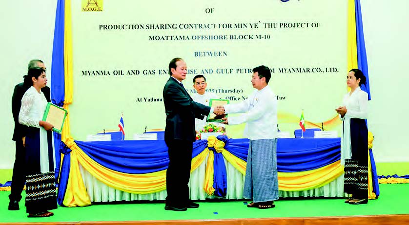THE Myanmar Oil and Natural Gas Enterprises and Myanmar-based Thailand national-owned Gulf Petroleum Myanmar Co Ltd organized the signing ceremony of the Production Sharing Contract for Min Ye Thu Project Mottama offshore Block M-10 in Nay Pyi Taw yesterday.