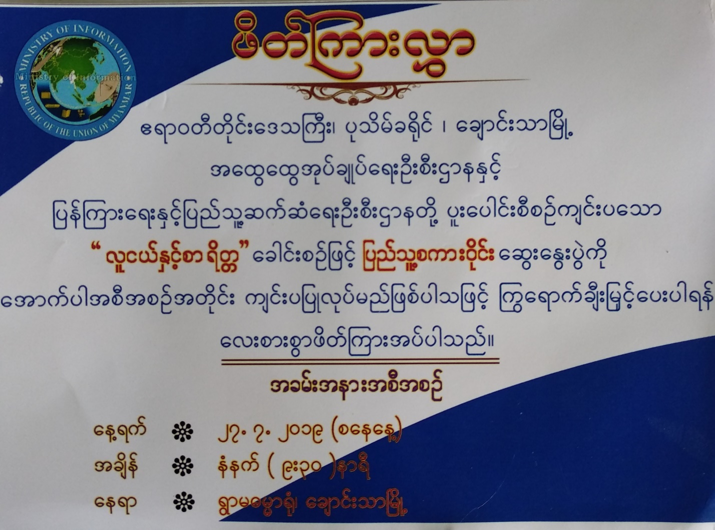 With the aim of improving moral character of youth, Public Talks will be jointly organized by Information and Public Relations Department and General Administration Department in Chaungthar.