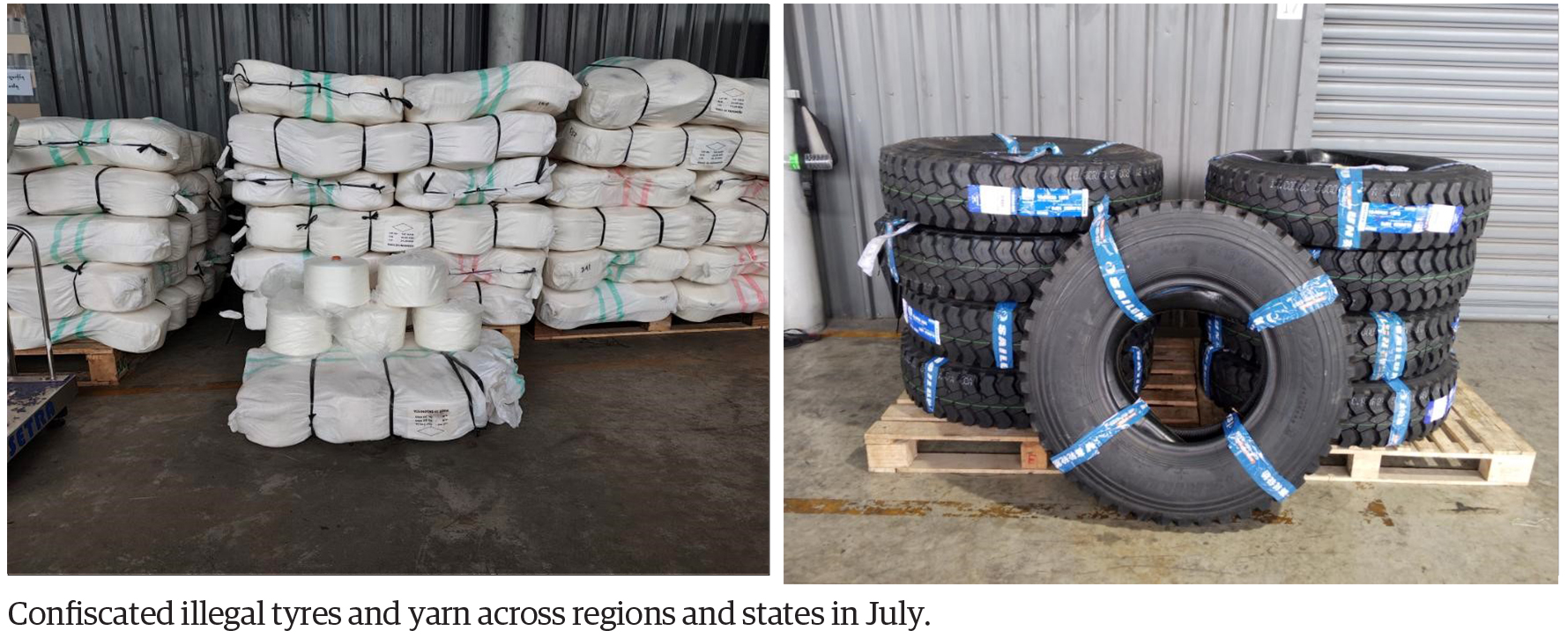 Thanks to tip-offs from responsible members of the public, a total of 46 reports were received in July 2025, of which four were false, two were delayed, and 40 were confirmed and resulted in seizures. These led to the opening of 85 cases involving a wide variety of items such as different types of timber, industrial goods, consumer products, and foodstuffs. The estimated value of the seized goods was K2,594.018 million, which also included vehicles used to transport illegal goods, both unregistered vehicles and motorcycles.