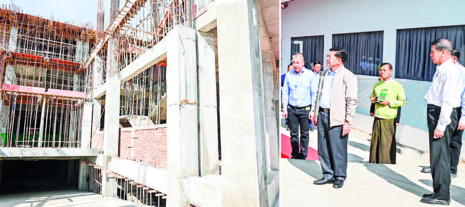 At the six-storey market construction project of Thumingala Market (Nyantaw Market) in PyinOoLwin, the Senior General heard reports on work progress of the project, plans to open shops on each floor, construction for playgrounds and cinemas, installation of solar panels to generate electricity, architectural designs for Local Fresh Fruits & Meats Market and Banking Service Area on the ground floor, battery chargers for EV cars at the car parks, proper flow of water in drains, and sewage water system presented by Mandalay Region Chief Minister U Myo Aung.