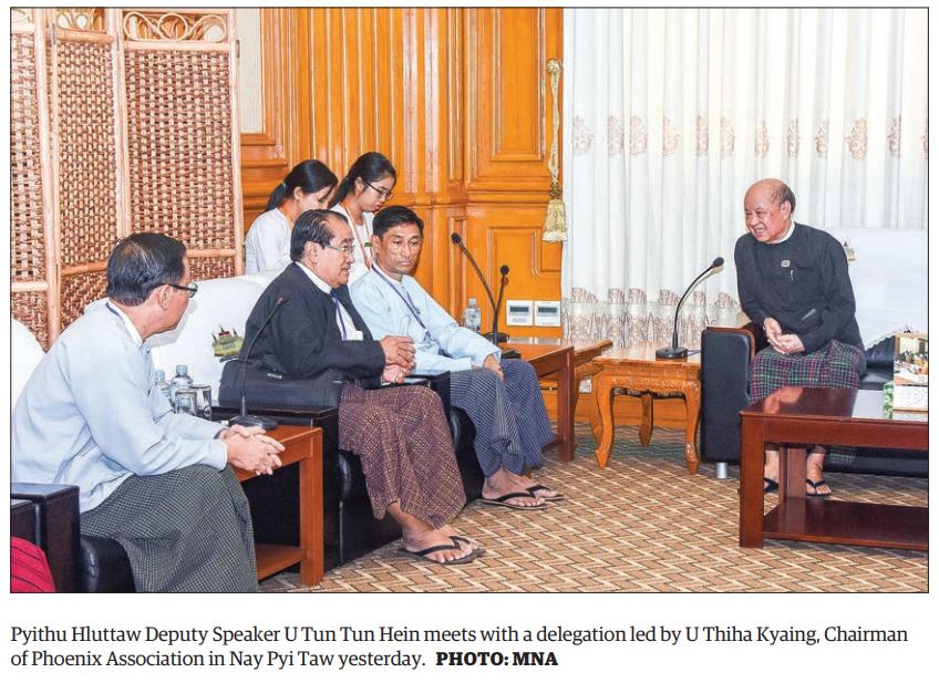 PYITHU Hluttaw Deputy Speaker U Tun Tun Hein received a delegation led by U Thiha Kyaing, Chairman of the Phoenix Association, yesterday at his office in Nay Pyi Taw.