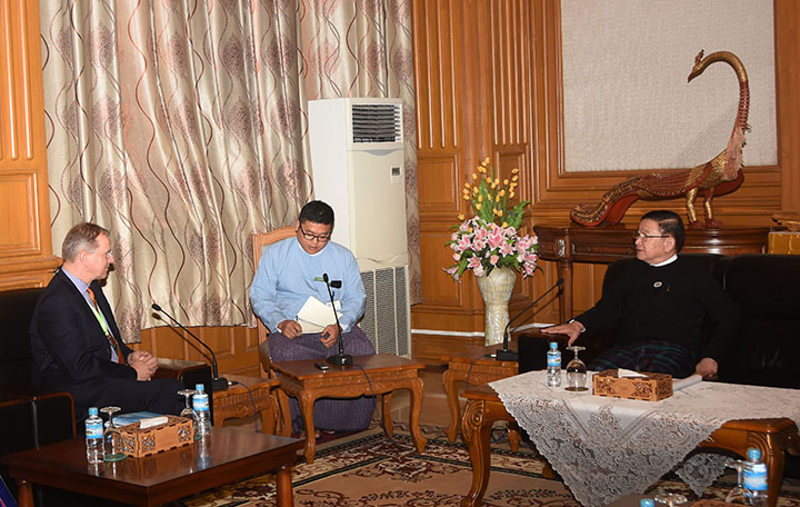 Pyithu Hluttaw Speaker U T Khun Myat received Mr Johan Cels, UNHCR Representative in Myanmar, at his office of Hluttaw Building in Nay Pyi Taw yesterday.