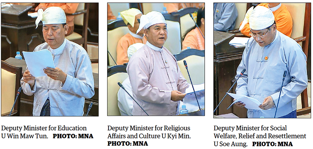 Deputy Minister for Social Welfare, Relief and Resettlement U Soe Aung replied to a question raised by U Kyaw Thaung of Sagaing Region constituency 1 on opening a district social welfare office in Sagaing while Deputy Minister for Education U Win Maw Tun responded to questions raised by Daw Ei Ei Pyone of Ayeyawady Region constituency 8 on a plan to provide education support material and assign dedicated teachers for KG, U Kyaw Tote of Mandalay Region constituency 7 on a plan to teach political science as a specialized subject in arts and science universities, U Zon Hle Htan of Chin State constituency 4 on a plan to open a government technical high school in Chin State Falam Town, Daw Nang Moe Moe Htwe of Kayin State constituency 4 on a plan to build a new school building in Kayin State Hlaingbwe Township Shan Ywathit Town, Maethamu village tract, Kree Phoe Kwi village sub basic middle school, U Myo Htat @ Salai Myo Htike of Chin State constituency 12 on a plan to employ primary school teachers in Chin State Paletwa Township and Dr. Zaw Lin Htut of Mon State constituency 9 on a plan to demolish a dangerous school building and constructing a new one in Mon State, Thaton Township, Bin Hline Ward, Mayanchaung Basic Education post primary school.