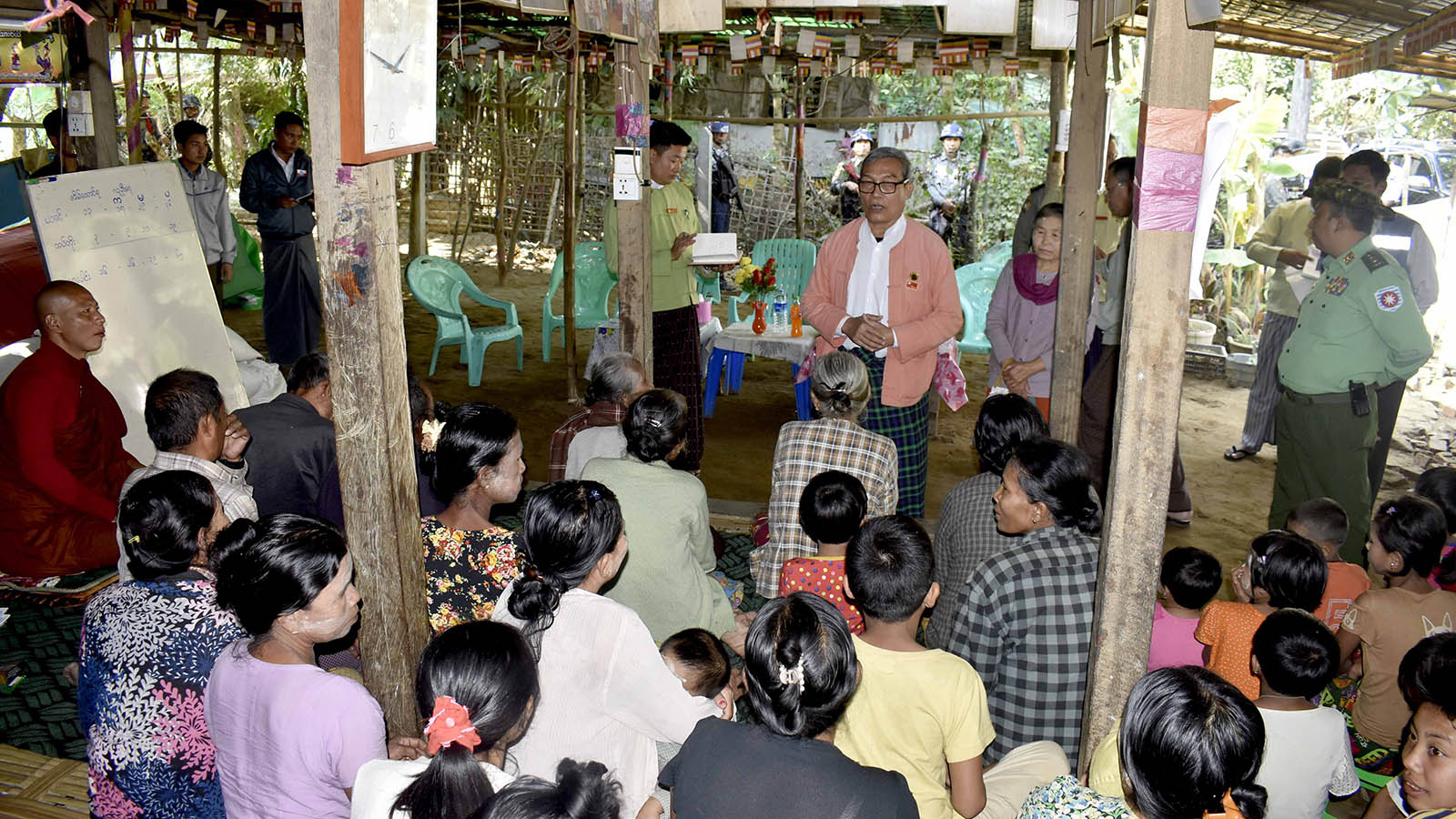 Chief Minister U Nyi Pu, State Security and Border Affairs Minister Colonel Min Than, State Social Affairs Minister Dr Chan Thar and officials first arrived at Dhamma Rama Pariyatti Monastery. They paid respect to the presiding monk of the monastery, and met with 359 IDPs—135 men and 224 women— from 99 households. The Chief Minister and party comforted the people who are receiving healthcare services of Public Health Department of Sittway Township. Chief Minister U Nyi Pu offered assistance to the IDPs for foods, medicines and education for the children of displaced families and explained the government’s efforts on restoring peace and stability.