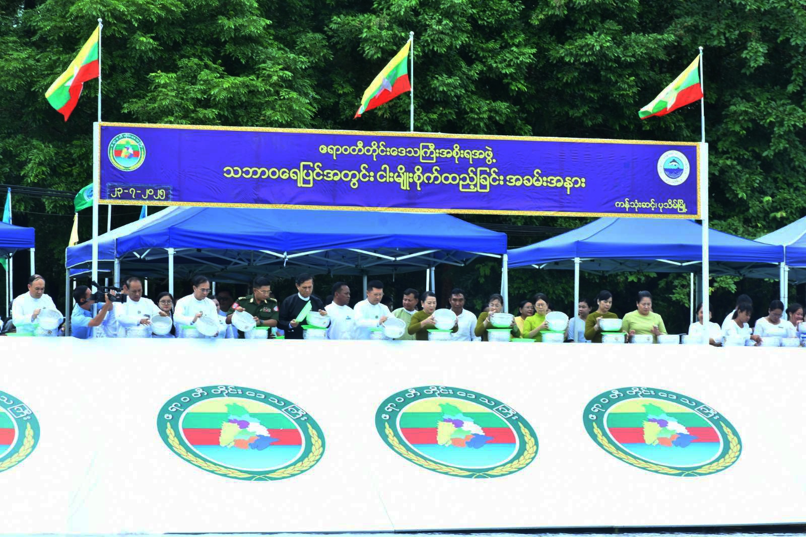 A fish stocking ceremony was held this morning at Kanthonesint Lake in Pathein Township, Ayeyarwady Region. The event was attended by Ayeyarwady Region Chief Minister U Tin Maung Win and his wife, members of the regional government and their spouses, regional, district, and township-level departmental officials, as well as members of the public.