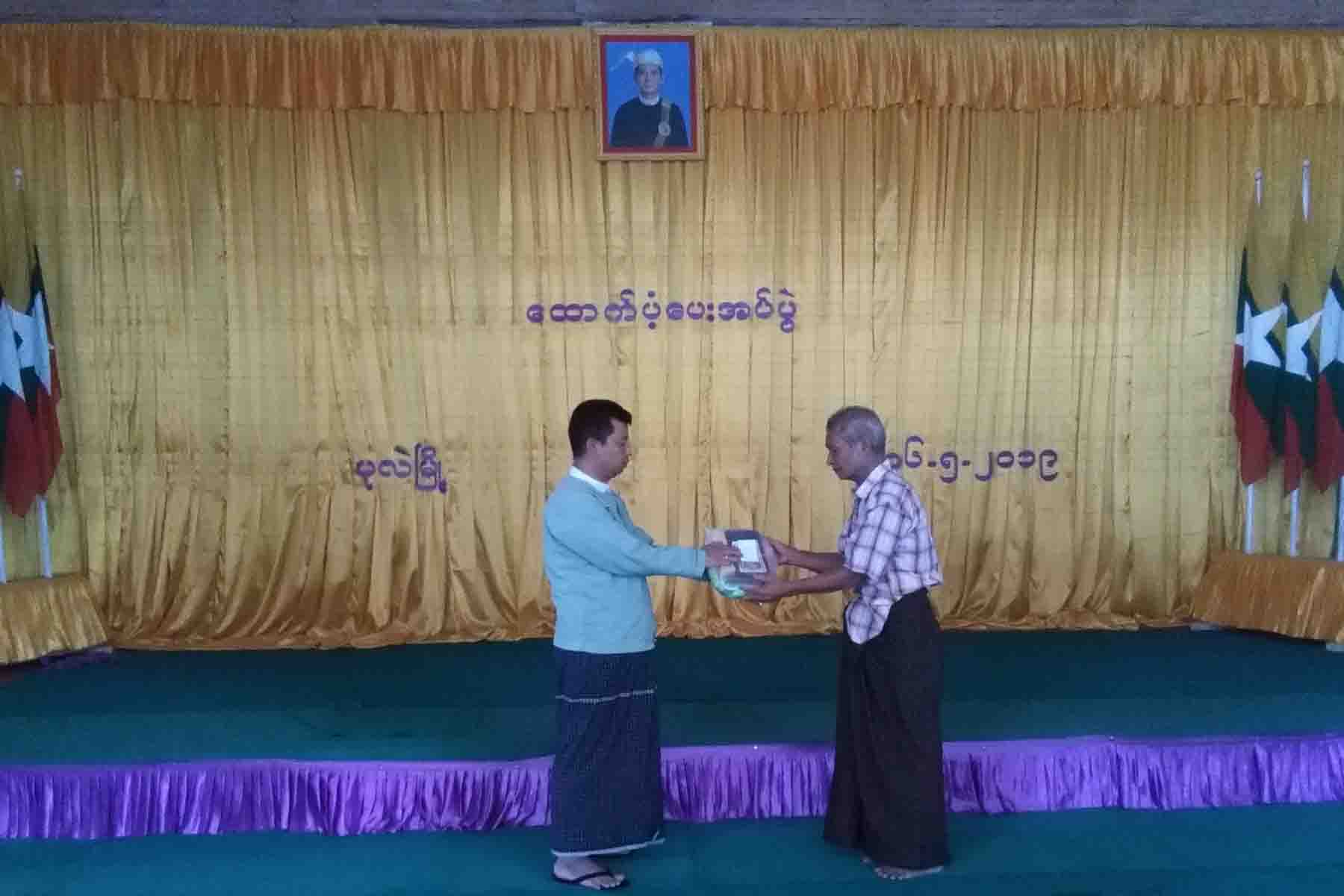 Chairman of Pale Township Management Committee U Toe Toe Win provided cash aids for rice and construction materials and five kinds of rescue items to 17 households in Nweshouk village. In addition, four households in Zaung-gyan-daung village were also provided cash aids for rice and construction materials and rescue items.