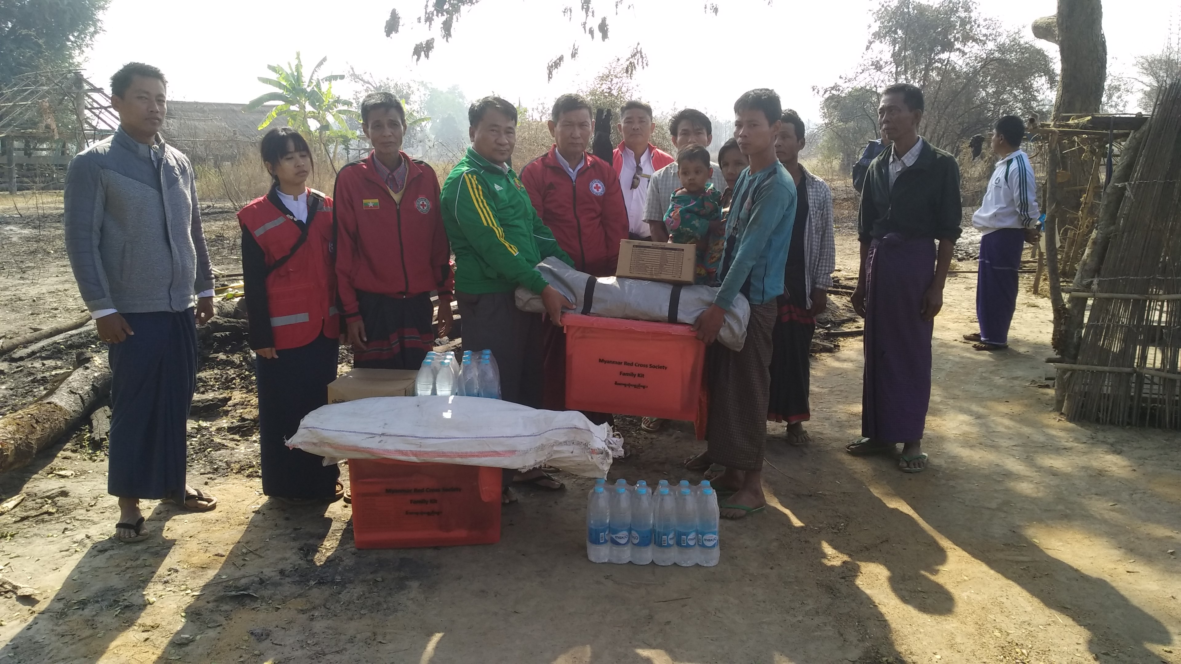 Fire victims caused by forest fire in Ooshitkhin village in Kyaukgyi Township, Taungoo District, Bago Region were provided with relief items by Township Red Cross Society this morning.