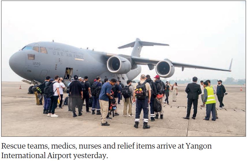 THE government investigates the damage in quake-hit areas and conducts the rescue work promptly. It also opens ways for foreign-aided humanitarian in-kind assistance. Three UAE military aircraft carrying UAE rescue teams, medics, nurses and humanitarian supplies ar­rived at Yangon International Airport yesterday morning.
