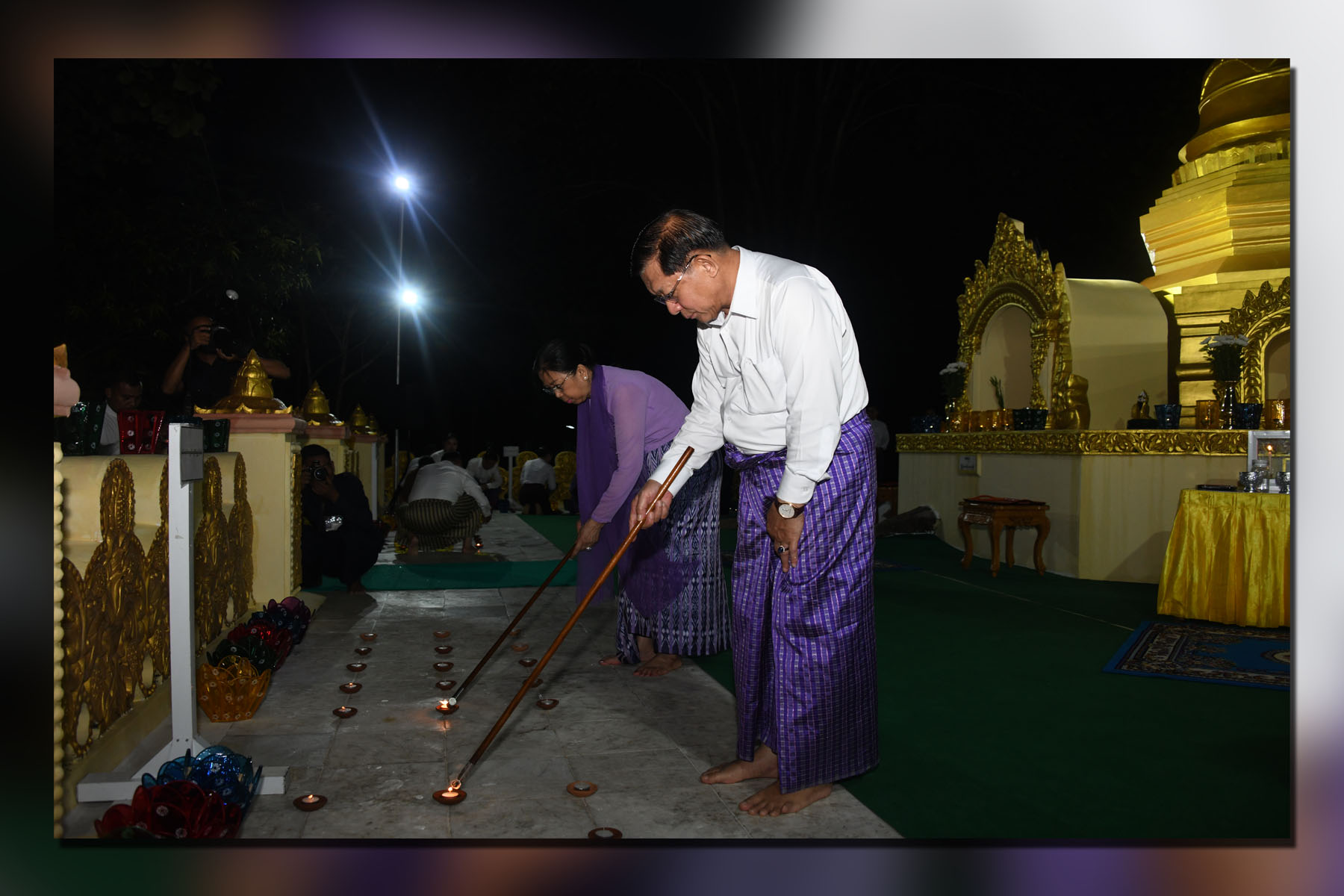 Yesterday evening, Acting President of the Republic of the Union of Myanmar and State Security and Peace Commission Chairman Senior General Min Aung Hlaing and his wife Daw Kyu Kyu Hla, Commission Vice-Chairman Vice-Senior General Soe Win and his wife Daw Than Than Nwe, Commission Member and Executive Chief U Aung Lin Dwe and his wife, Commission Secretary and Joint Executive Chief General Ye Win Oo and his wife, Commission Member and Chief of the General Staff (Army, Navy and Air) General Kyaw Swa Lin and his wife, Union-level dignitaries, Union ministers and their wives, senior Tatmadaw officers from the Office of the Commander-in-Chief and their wives, lit candles, oil lamps, offered flowers and water dedicated to the Lord Buddha at Shwephonepwint Pagoda in Zeyathiri Township of Nay Pyi Taw Union Territory and enjoyed the Tazaungdine lighting festival.