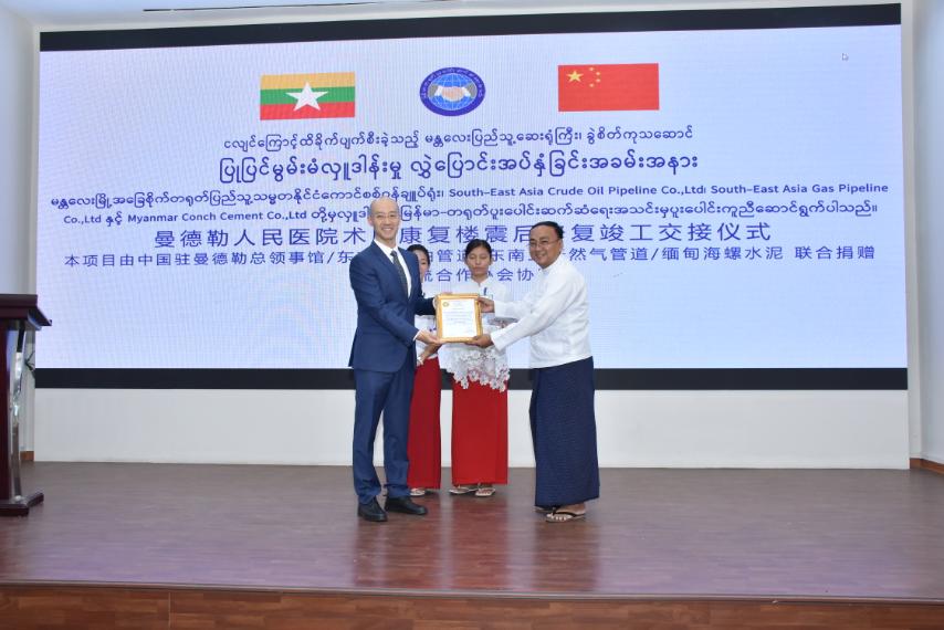 Following the handover, the Medical Superintendent and officials presented certificates of honour and recognition to the Deputy Consul-General and representatives from Myanmar-China Oil and Gas Pipeline Co Ltd, Myanmar Conch Cement Co Ltd and the Myanmar-China Cooperation Association, in appreciation of their contributions to the project.
