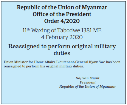 Republic of the Union of Myanmar Office of the President Order 4 / 2020