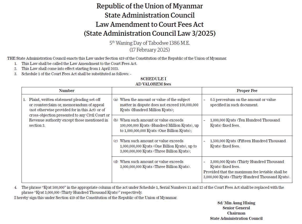 Republic of the Union of Myanmar State Administration Council Law Amendment to Court Fees Act (State Administration Council Law 3/2025) 5th Waning Day of Tabodwe 1386 M.E. (17 February 2025)