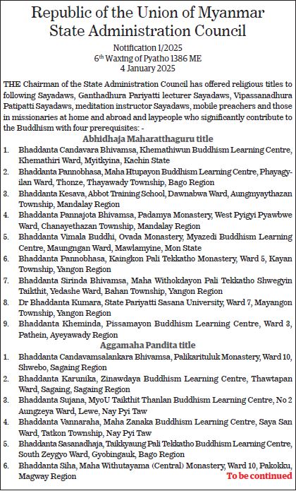 Republic of the Union of Myanmar State Administration Council Notification 1/2025 6th Waxing of Pyatho 1386 ME 4 January 2025