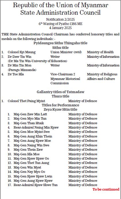 Republic of the Union of Myanmar State Administration Council Notification 2/2025 6th Waxing of Pyatho 1386 ME 4 January 2025