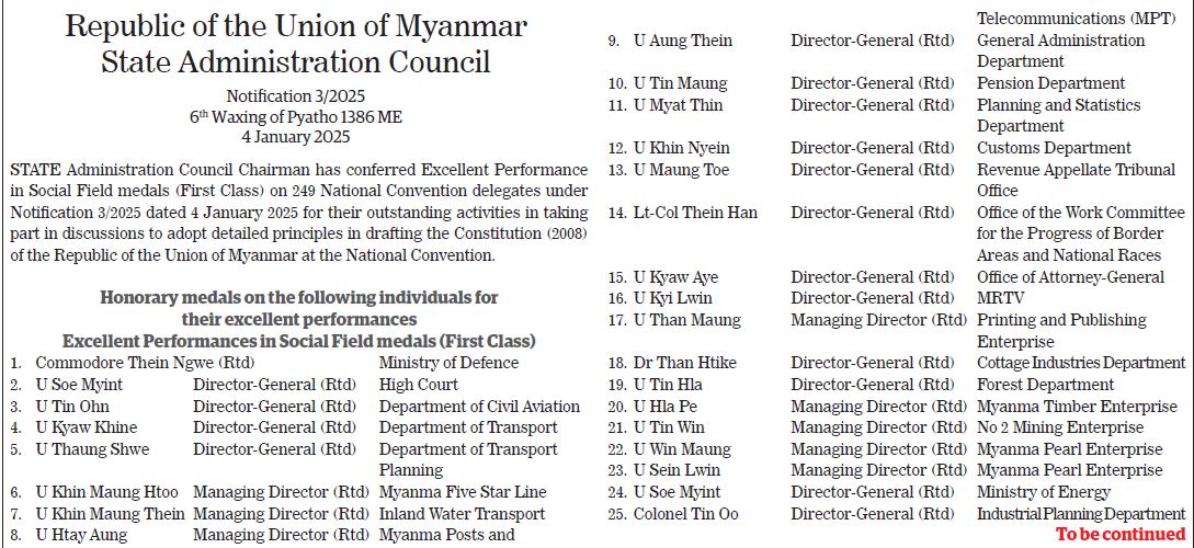 Republic of the Union of Myanmar State Administration Council Notification 3/2025 6th Waxing of Pyatho 1386 ME 4 January 2025
