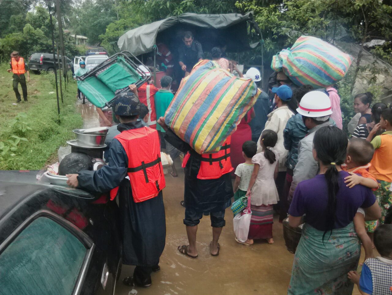 As the downpours continuously hit Kawkareik and Kyonedoe, water entered into the houses in wards and villages. Accordingly, a total of 2735 people from 583 households were evacuated to nearby rescue camps and their relatives’ houses. Two rescue camps that were opened at BEPS-6 and warehouse of an Agricultural Trading were experiencing inundation of water. Therefore, 465 people from 103 households from the two camps were removed to a camp in BEHS (Kyonedoe).