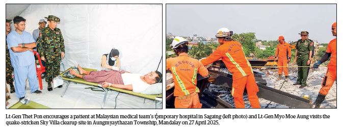 Yesterday, Lt-Gen Thet Pon from the Office of the Commander-in-Chief (Army) and officials viewed round healthcare services provided by a Malaysian medical team at the relief camp in Parami Ward of Sagaing, clearing of debris at Thutethaka nunnery in Thawtapan Ward, healthcare services by a Tatmadaw medical team to members of the Sangha, nuns and people at Thanponnarama Monastery.
