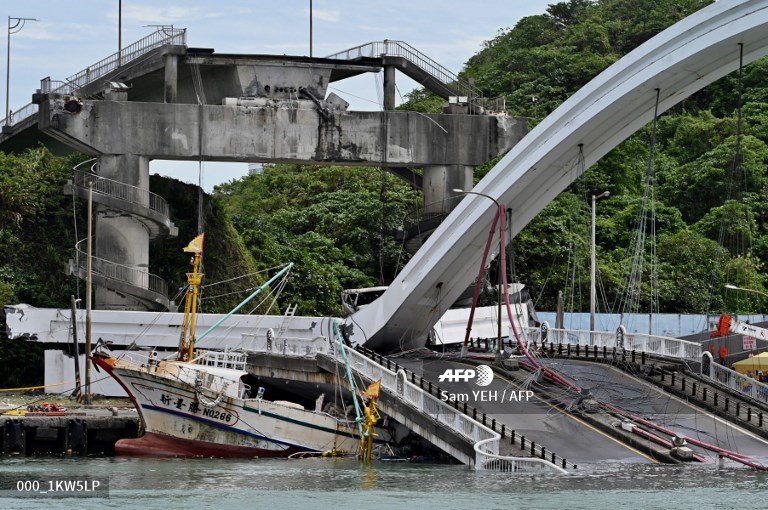 Dramatic CCTV images captured the moment the 140-metre (460-foot) long single-arch bridge came crashing down in Nanfangao, on Taiwan's east coast.
