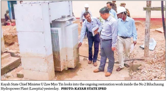 KAYAH State Chief Minister U Zaw Myo Tin visited the Beluchaung No 2 Hydropower Plant yesterday to assess the ongoing restoration work following flooding caused by rising water levels in the Belu Creek. Floodwaters began entering the plant on 30 September, which led to a suspension of generating electricity. As the water level at the plant yard has receded, efforts are being accelerated to restore operations and resume power generation.