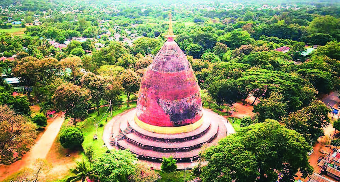 The Bawbawgyi Pagoda is one of the oldest structures in the ancient Pyu city of Sri Ksetra, while the Lemyethna Temple is another notable example of Pyu architecture. Built around the 6th–7th century AD, the Bawbawgyi Pagoda stands 46.634 metres high and has a circumference of 64.8 metres. Its design features a five-tiered platform topped by a long, cylindrical brick structure. The pagoda is said to resemble the Dhamek Stupa in Sarnath, India, a memorial site where the Buddha delivered the Anattalakkhana Sutta, also known as the Discourse on the Characteristic of Non-self.