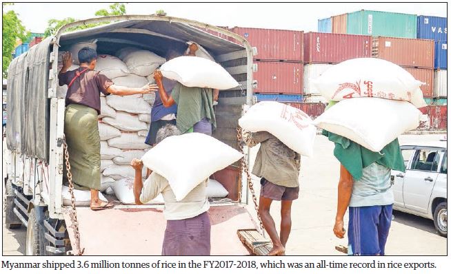 Myanmar shipped 3.6 million tonnes of rice in the FY2017- 2018, which was an all-time record in rice exports. The export volume plunged to 2.3 million tonnes in the FY2018-2019. — KK/GNLM