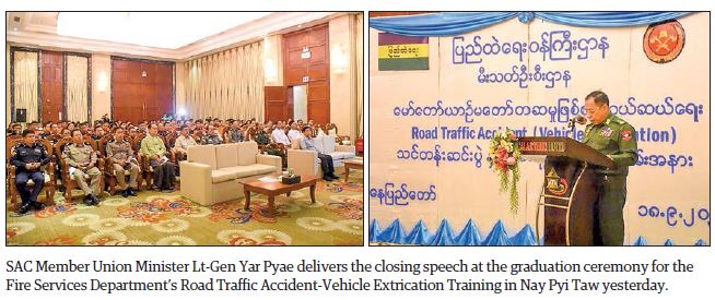 The Ministry of Home Affairs announced that the graduation ceremony for the Fire Department’s Road Traffic Accident-Vehicle Extrication Training took place yesterday morning in Dekkhinathiri Township, Nay Pyi Taw. The event was attended by SAC Member Union Minister for Home Affairs Lt-Gen Yar Pyae, who delivered the speech.