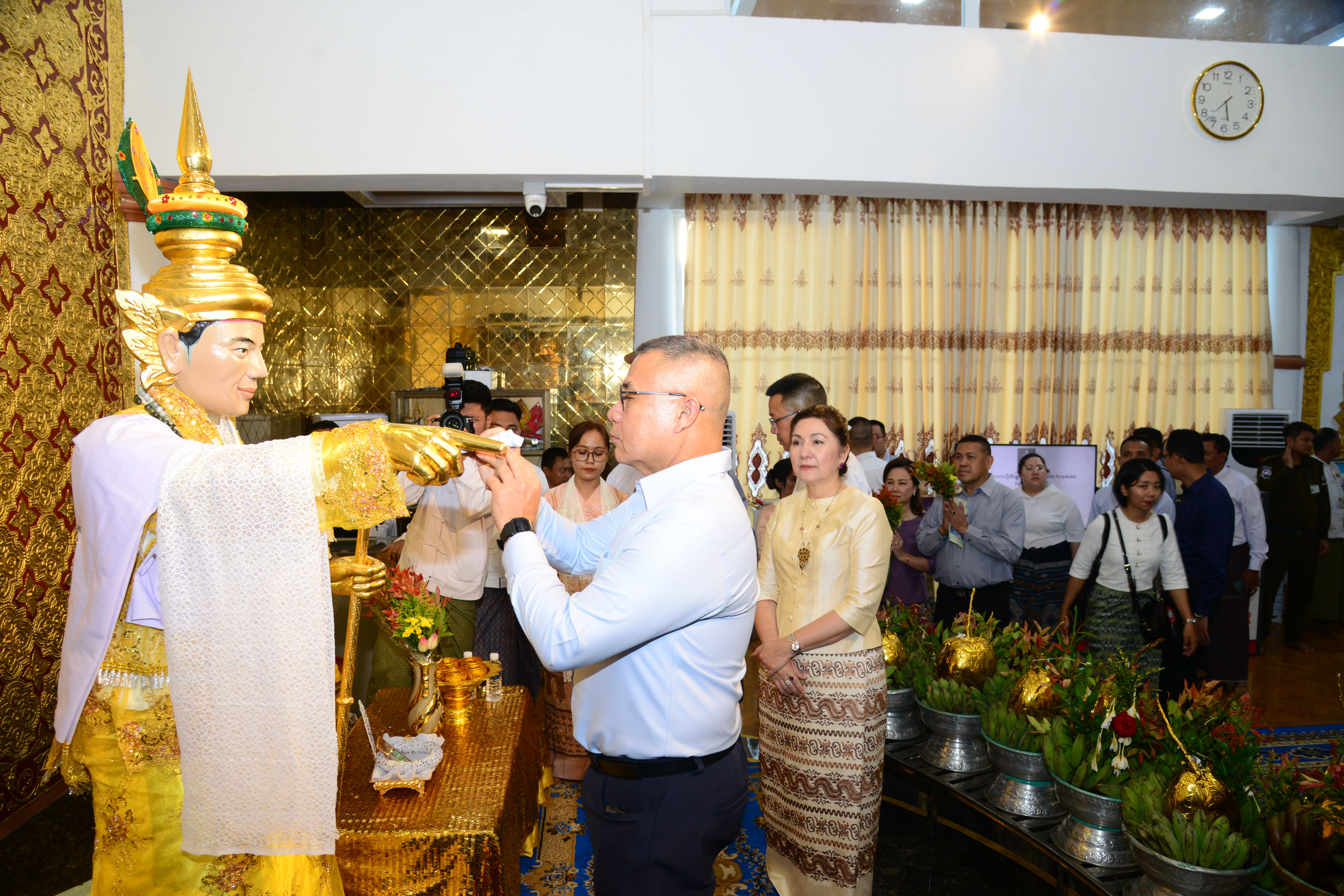 Commander-in-Chief (Air) General Tun Aung then had a discussion with the goodwill delegation led by Air Chief Marshal of the Royal Thai Air Force at the Jasmine Hotel. The Commander-in-Chief (Air) presented a Buddha statue, relics of Arhats and a repli­ca of the Maravijaya Buddha Image to enshrine in the Phra Mahathat Naphamethinidon Naphabhumisiri Pagoda being constructed by the Royal Thai Air Force in Chiang Mai, Thai­land, to the Air Chief. The Thai Air Chief presented a Buddha statue as a Dhamma donation, and they all had documentary photos taken.