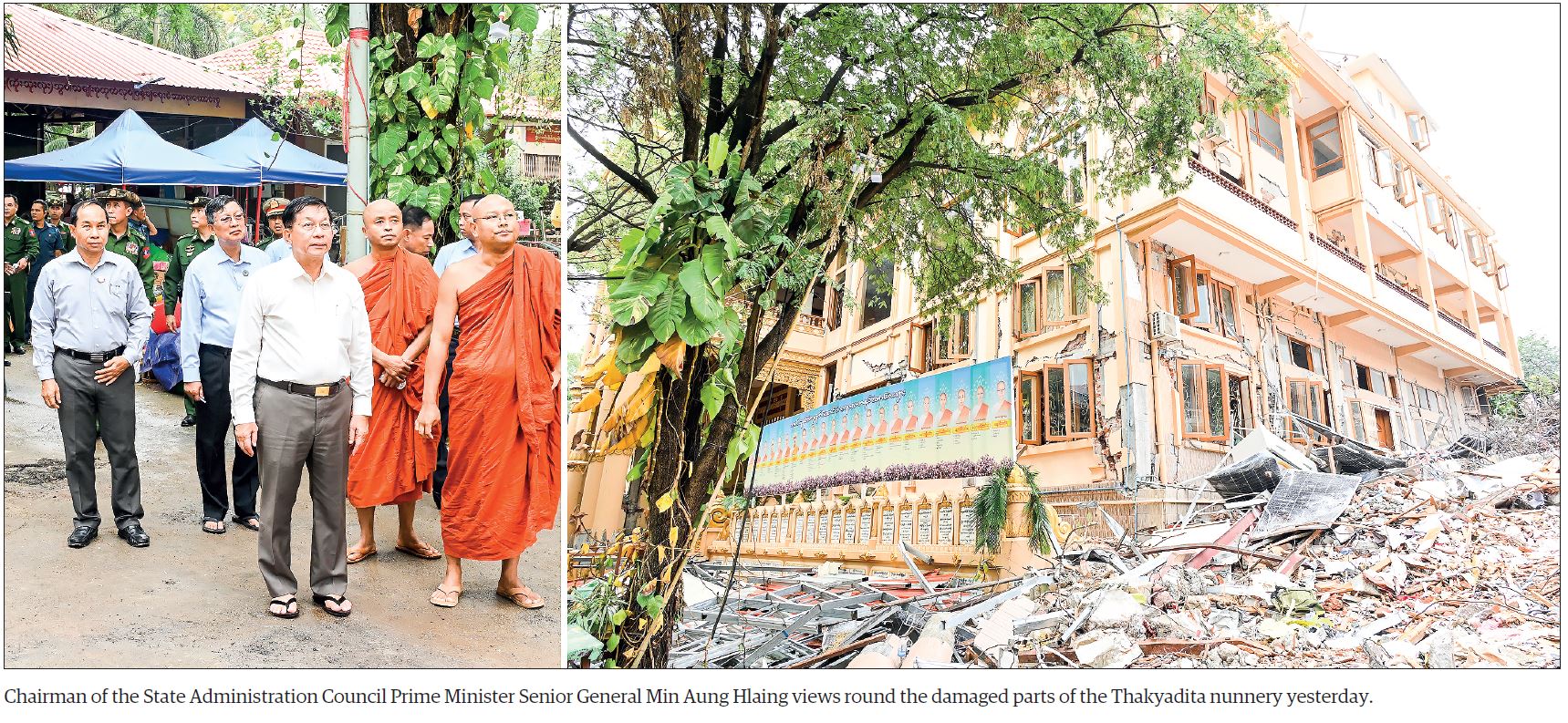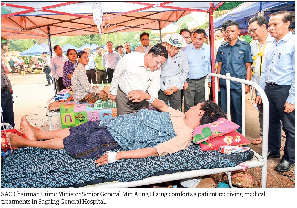 Chairman of the State Administration Council Prime Minister Senior General Min Aung Hlaing, accompanied by his wife Daw Kyu Kyu Hla, SAC Joint Secretary and his wife, council members, Union ministers, and senior Tatmadaw officers from the Office of the Commander-in-Chief, yesterday morning, inspected loss and damage in the incident of the powerful earthquake in Sagaing and ongoing rehabilitation process.