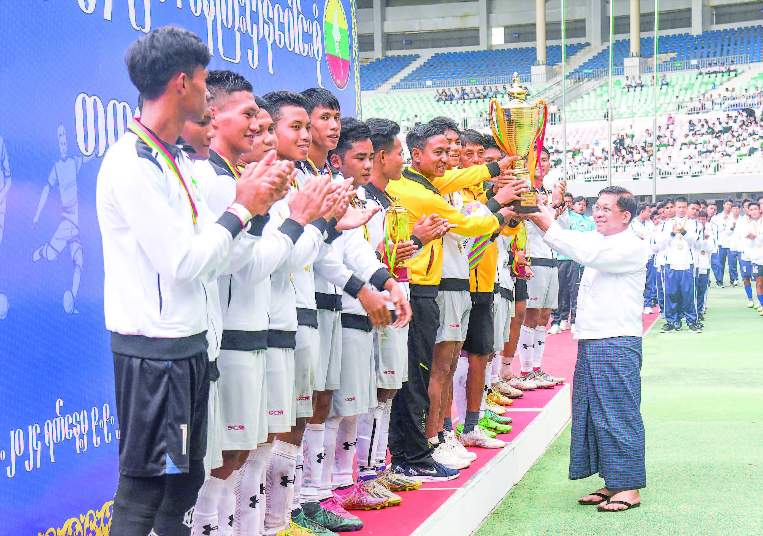 CHAIRMAN of the State Administration Council Prime Minister Senior General Min Aung Hlaing watched the final event of the Inter-Ministerial University Football Tournament 2024 at Wunna Theikdhi Stadium in Nay Pyi Taw yesterday afternoon and awarded the champion team.