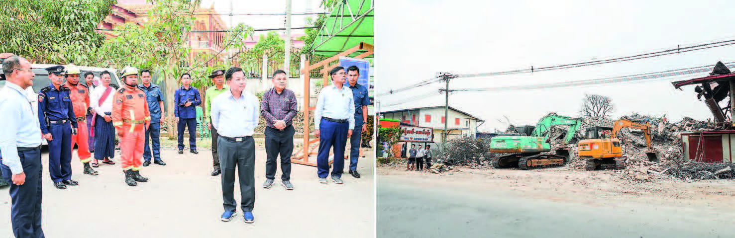 On arrival at the collapsed Hotel Aungban, the Senior General inspected search and rescue operations at the damaged site and gave necessary guidance to officials. The Senior General asked about the search and rescue measures of the rescue teams and fulfilled their needs.
