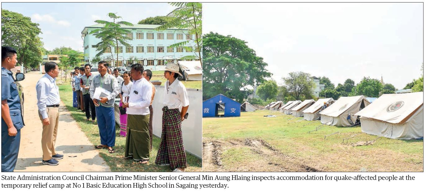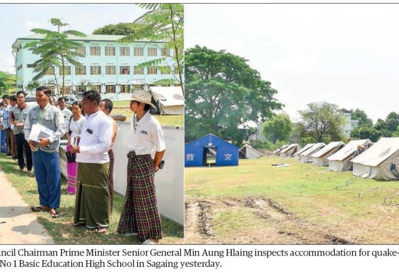At No 1 Basic Education High School, the Senior General inspected accommodation for quake-affected people at the temporary relief camp and the loss and damage to the school buildings. In response to the report of officials, the Senior General urged them to supervise the systematic repair of school buildings to be completed before opening of schools. He noted that if not, the dangerous school buildings must be dissolved systematically and left necessary instructions.