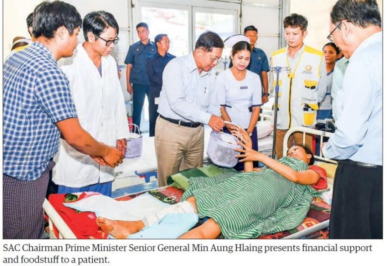 On arrival at Sagaing General Hospital, the Senior General viewed round medical treatment for members of the Sangha, nuns and residents who sustained injuries in the earthquake at the temporary hospital and necessary healthcare services. The Senior General comforted patients and presented financial support and foodstuff for the injured.