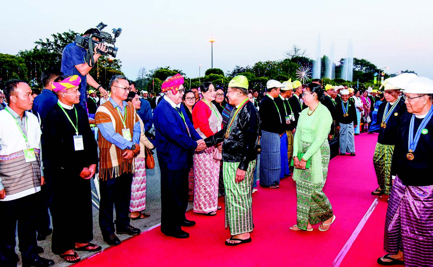 The Senior General and wife, and the Vice-Senior General and wife greeted ethnic traditional cultural troupes from regions and states, chairpersons and representatives of political parties, NCA signatory Ethnic Armed Organization leaders and representatives, economic ministers and ethnic affairs ministers of regions and states, MSME businesspersons, senior military officers from the Office of the Commander-in-Chief and their wives, Union ministers, Union-level dignitaries and their wives, SAC members and their spouses, and the Council Secretary and wife.