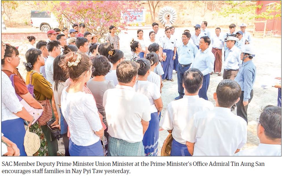 MEMBER of the State Administration Council Deputy Prime Minister and Union Minister at the Prime Minister’s Office Admiral Tin Aung San gave words of encouragement to earthquake-affected staff families of the Ministry of Electric Power, Ministry of Energy and Ministry at the Prime Minister’s Office in Nay Pyi Taw yesterday.