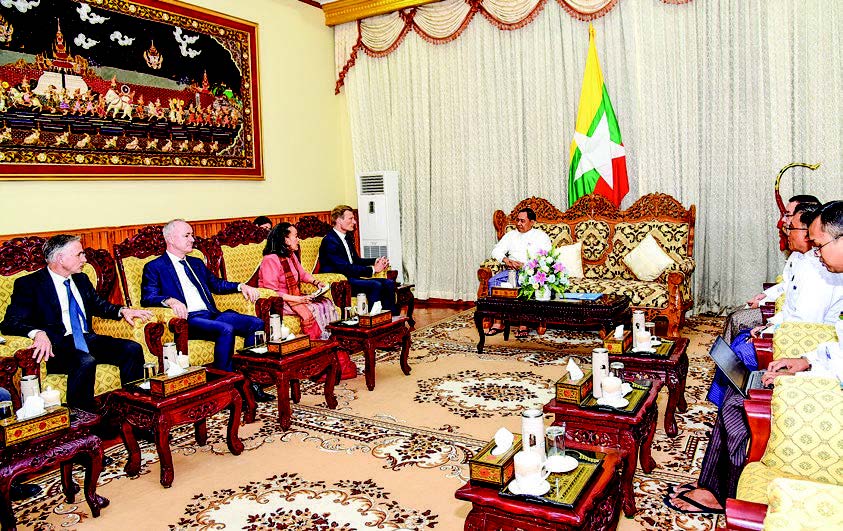 State Administration Council Member Union Minister for Home Affairs Lt-Gen Yar Pyae received the delegation led by Mr Carl Johan Orrenius Skau, Deputy Executive Director and Chief Operation Officer of the World Food Programme (WFP) yesterday in the reception hall of the Union Minister’s office.