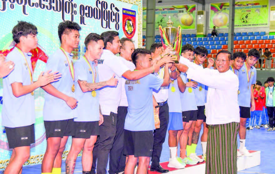 State Administration Council Members Daw Dwe Bu, Porel Aung Thein, Dr Hmuh Thang, Dr Ba Shwe, Khun San Lwin, U Shwe Kyein and U Yan Kyaw, Union ministers, deputy ministers, departmental officials, and relevant officials attended the final match and awarding ceremony of the 2024 Inter-State and Region Futsal Championship yesterday in Nay Pyi Taw.