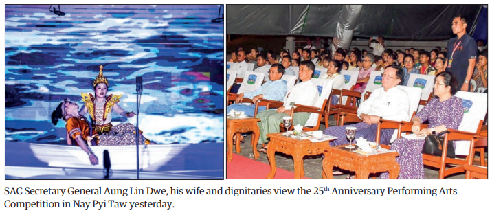 General Aung Lin Dwe, Secretary of the State Administration Council, and his wife attended the 25th Anniversary Myanmar Traditional Cultural Performing Arts Competition at the Nay Pyi Taw Development Committee’s Theatre yesterday evening.