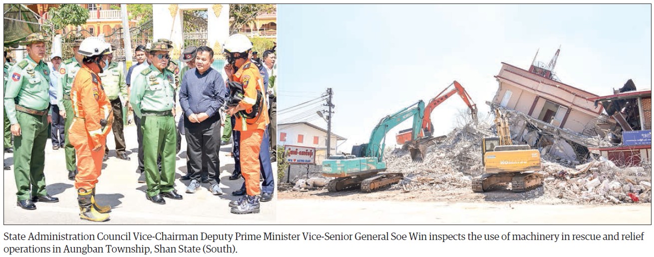 The Vice-Senior General inspected the collapse and damage of Hotel Aungban in Aungban and rescue operations with the use of heavy machinery. He gave instructions to a member of the Myanmar Engineering Council U Myo Myint and officials from the rescue teams.