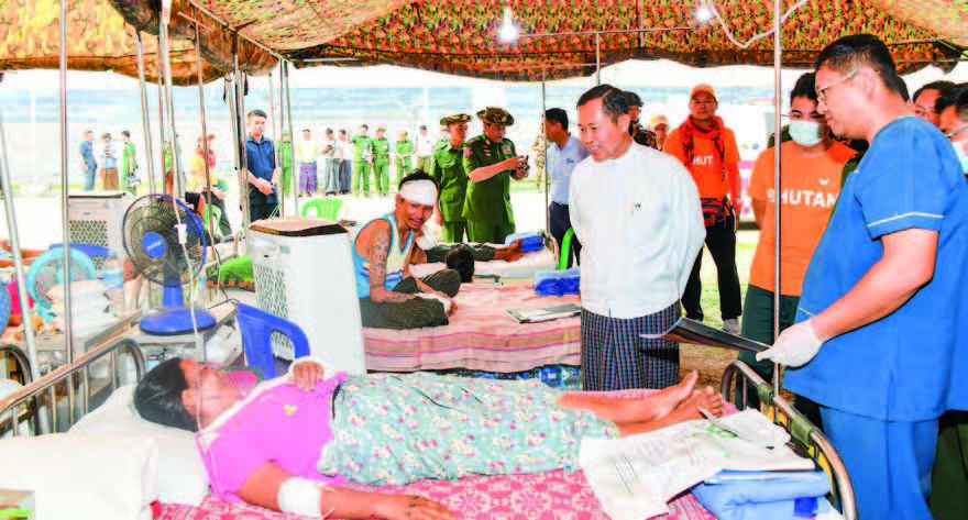 The temporary hospital (Paunglaung) is providing medical treatment for victims of the earthquake and other patients, with assistance from the Tatmadaw and the Ministry of Health. The hospital is staffed by specialists in surgery, obstetrics and gynaecology, paediatrics, orthopaedics, ophthalmology, ENT, neurology, psychiatry, pathology, pharmacy, and public health, as well as doctors, nurses, and medical officers. It is equipped with mobile surgical and X-ray vehicles and necessary medical instruments, providing round-the-clock care to those injured and others in need of healthcare services. Up to now, 36 critical patients and 60 outpatients have received the necessary healthcare services. Moreover, a team of 40 medical personnel from Bhutan, sent by the King of Bhutan, is also collaborating to providing essential medical treatment and supplies at the temporary hospital (Paunglaung). This Bhutanese medical team is establishing a separate temporary hospital and will continue to provide necessary healthcare services to the victims of the earthquake with compassion and support. — MNA/TTA