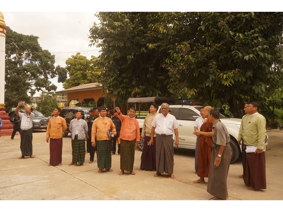 Chief Minister Dr. Myint Naing and party arrived in Ye-U at 1:00 pm and offered offertories to the presiding monk at Mingalarama monastery in Aungmingalar ward. Then, they inspected damage to Sutaungpyi Buddha image, a new religious building in Aungmingalar ward, damage to a pagoda in Tantabin monastery in Boaungzeya ward, damages to Phaungdawoo pagoda in Mae O village.