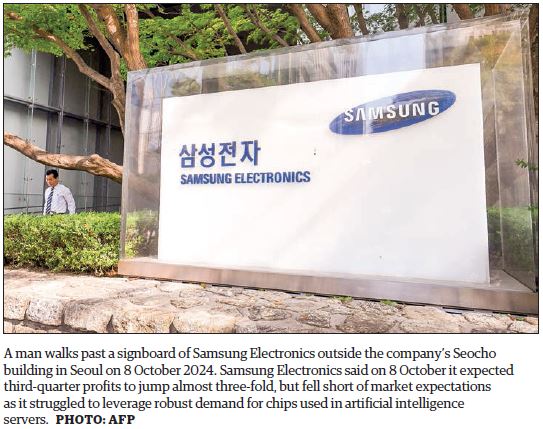 Samsung said it expected third-quarter profits to rise to 9.1 trillion won ($6.8 billion), up 274.5 per cent from a year earlier, falling short of market expectations as the company struggles to leverage robust demand for the chips used in artificial intelligence servers.