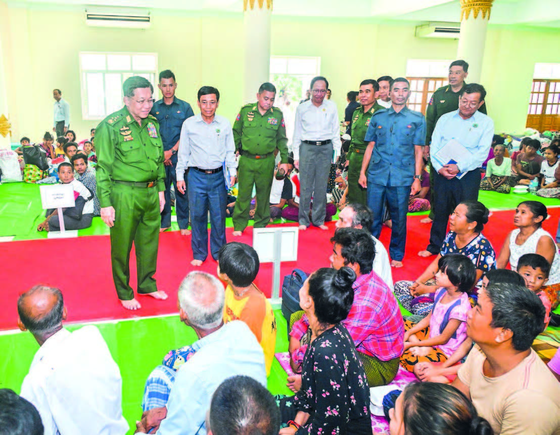 Senior General Min Aung Hlaing pledged, “We will provide cash assistance for the totally damaged buildings, damaged huts, partially damaged houses and huts, one-storey houses and two-storey houses as much as possible.”