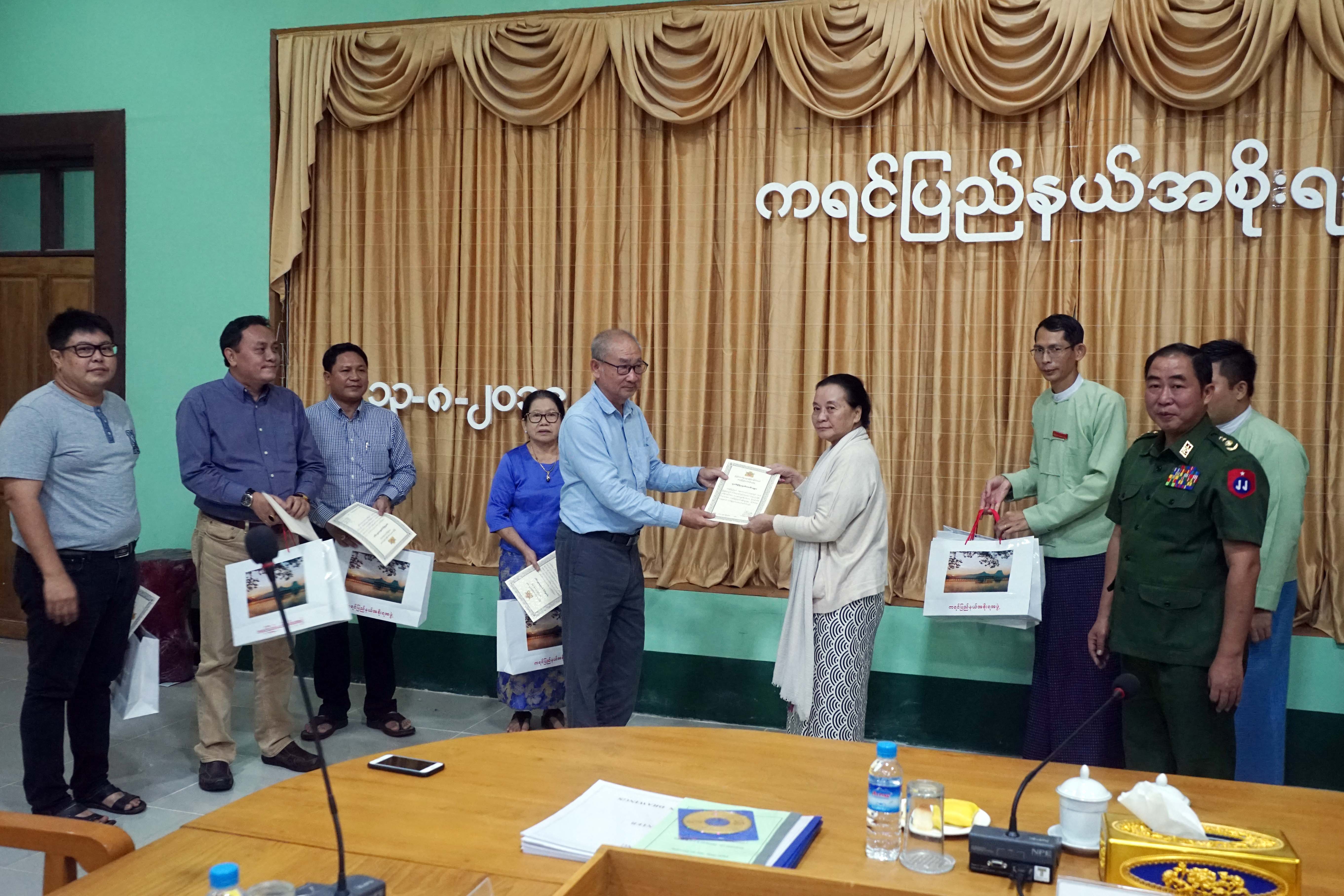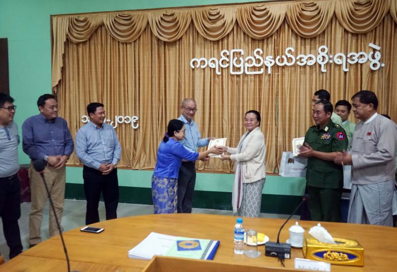 The boats were presented to Chief Minister of Kayin State Daw Nang Khin Htwe Myint during a ceremony held at the meeting room of the local government in Hpa-an on 13 August. At the event, the chief minister spoke words of thanks, saying the local government recognizes the contribution and generosity of donors to the flood victims. Next, the donors handed over seven fiber boats to the chief minister who returned certificates of honour to them. The fiber boats will be delivered to flooded areas such as Paingkyone, Hlaingbwe, Kyainn-Seikkyi and Kyonedoe.