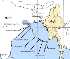 Frequently squalls with rough to very rough seas will be experienced in Deltaic, off and along Rakhine Coasts. Surface wind speed in squalls may reach 50-55 miles per hour and wave height will be about 11-15 feet in Deltaic, off and along Rakhine Coasts.