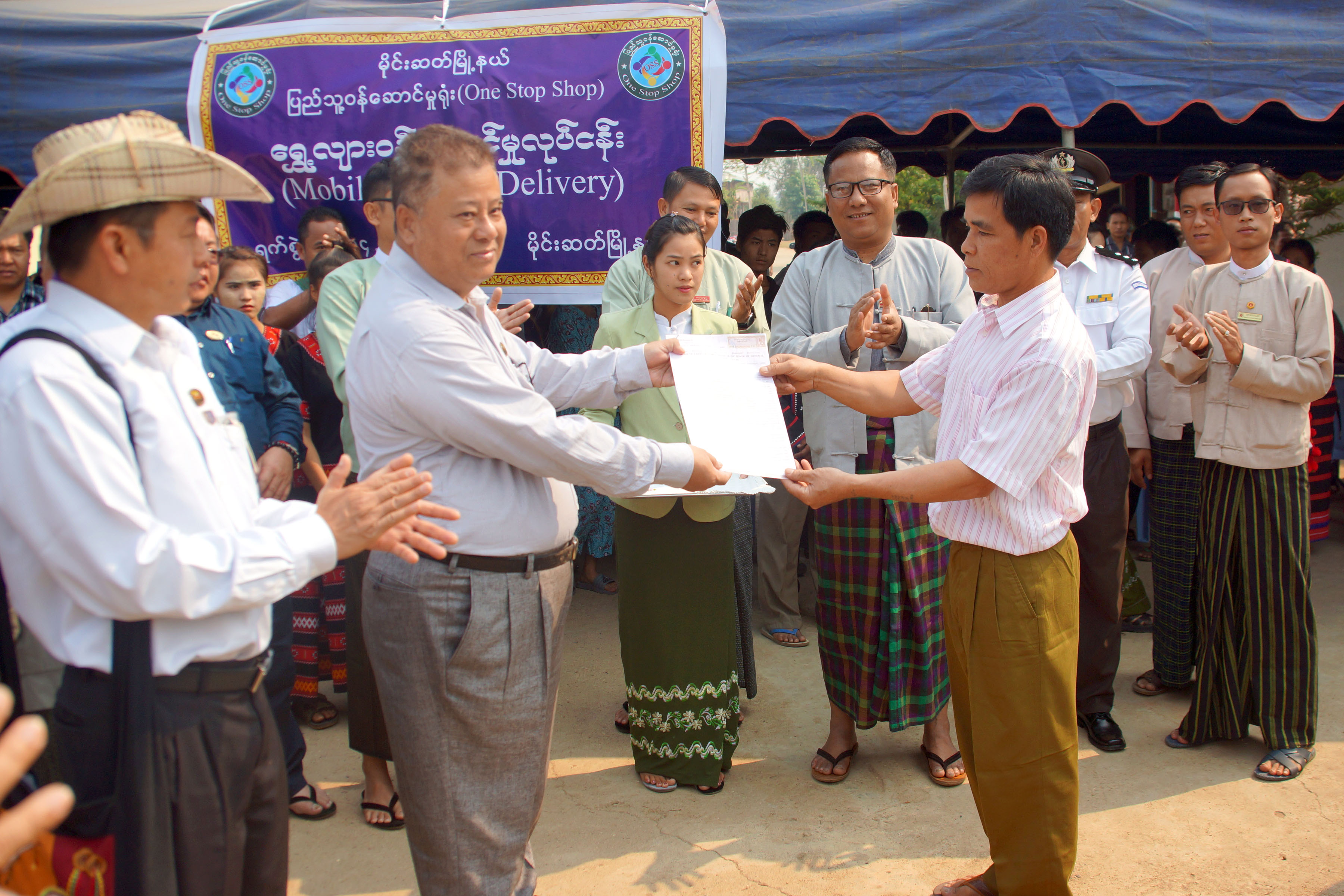 The chief minister and his entourage first viewed offering services by the employees from One Shop Step (OSS) in Tanthsai Village where he called for providing services to the public in real time. They also presented household certificates, citizenship scrutiny cards and land use certificates (Form-7) to the residents. Next, the chief minister proceeded to a hydropower plant being implemented by Lwesamon Company.