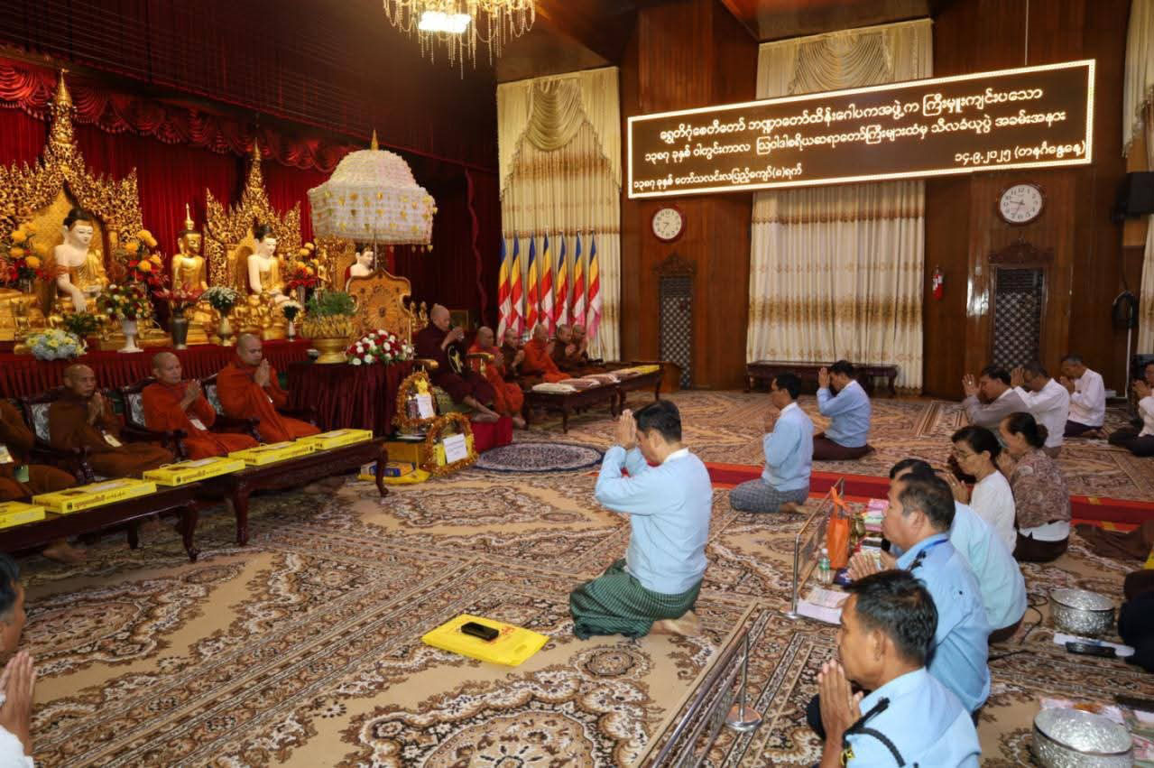 The ceremony was attend­ed by the board members, the staff of the board, religious ser­vice groups, donors and pilgrims, and they observed nine precepts under the guidance of Agga Maha Pandita Agga Maha Ganda Vasaka Pandita Bhadanta Gunha Linkara (Sayadaw of Maha Theindawgyi Pariyatti Monastery, Pabedan Township).