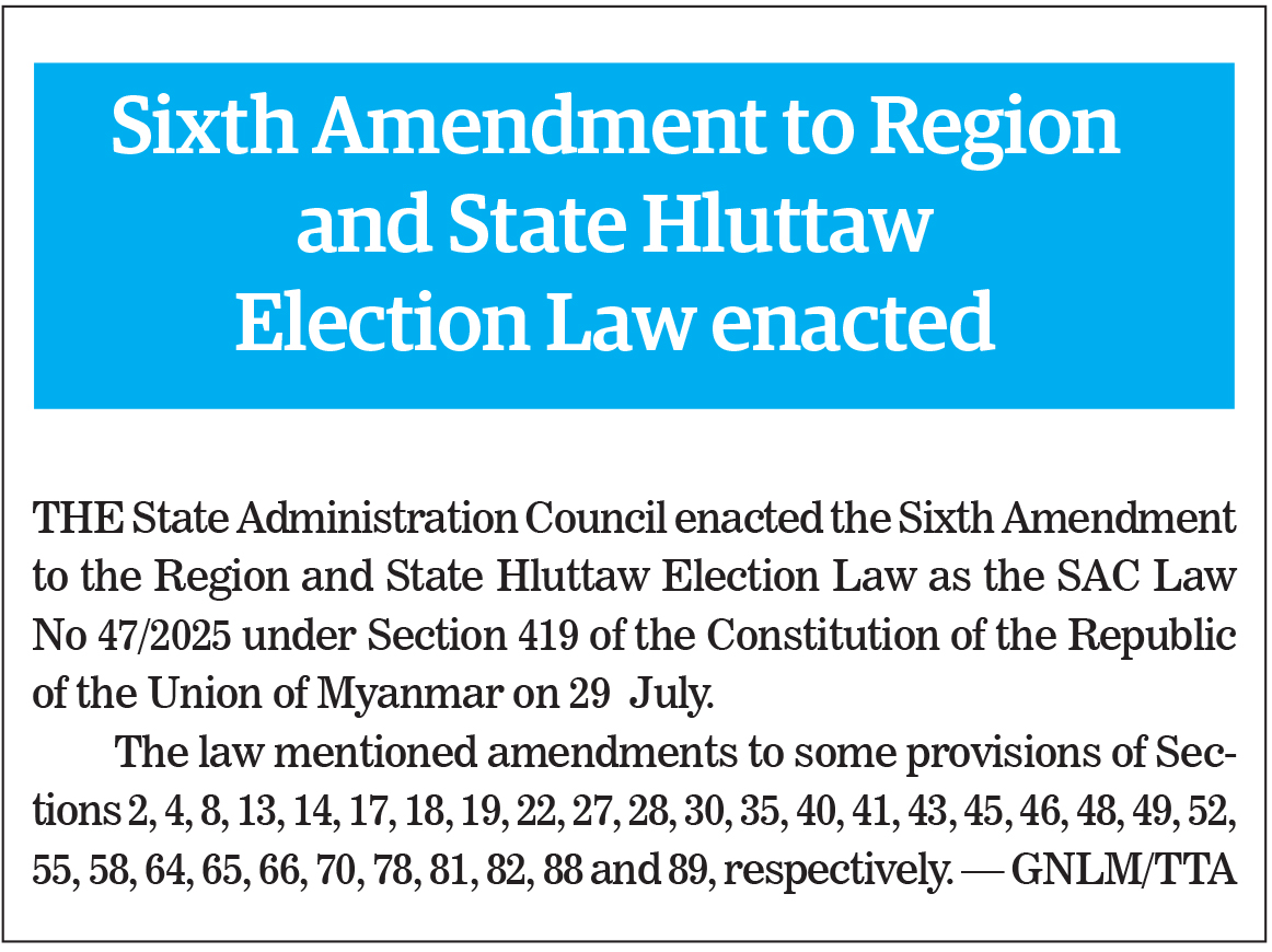 Sixth Amendment to Region and State Hluttaw Election Law enacted